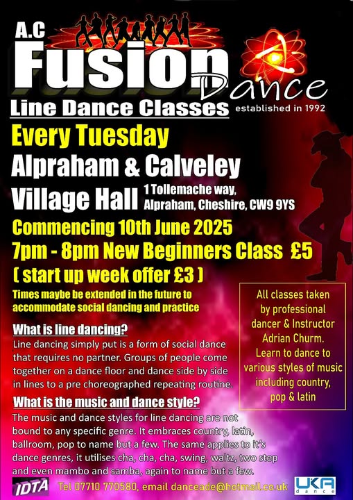 | Tuesday (eve) | Tarporley - Alpraham & Calveley Village Hall, 1 Tollemache Way, Alpraham, Tarporley, Cheshire CW6 9JE. (please note the postcode on the flyer is incorrect). Starts at 7:00 PM - 8:00 PM (beginner) - times may be extended to accommodate social dancing and practice. Please bring your own refreshments. Admission £5. Please click here to download a flyer for details of this class.. | AC Fusion - Adrian: 07710 770580 or email: danceade@hotmail.co.uk |