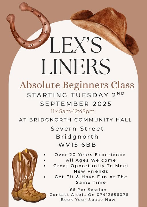 | Tuesday (day) | Bridgnorth - Bridgnorth Community Hall, Severn St., Bridgnorth WV15 6BB. Starts at 11:45 AM - 12:45 PM (absolute beginners). **NEW CLASS STARTING 2ND SEPTEMBER 2025**. Admission £6. Please click here to download a flyer for details of this class.. | Lex's Liners (Alexis): 07412 656076 |