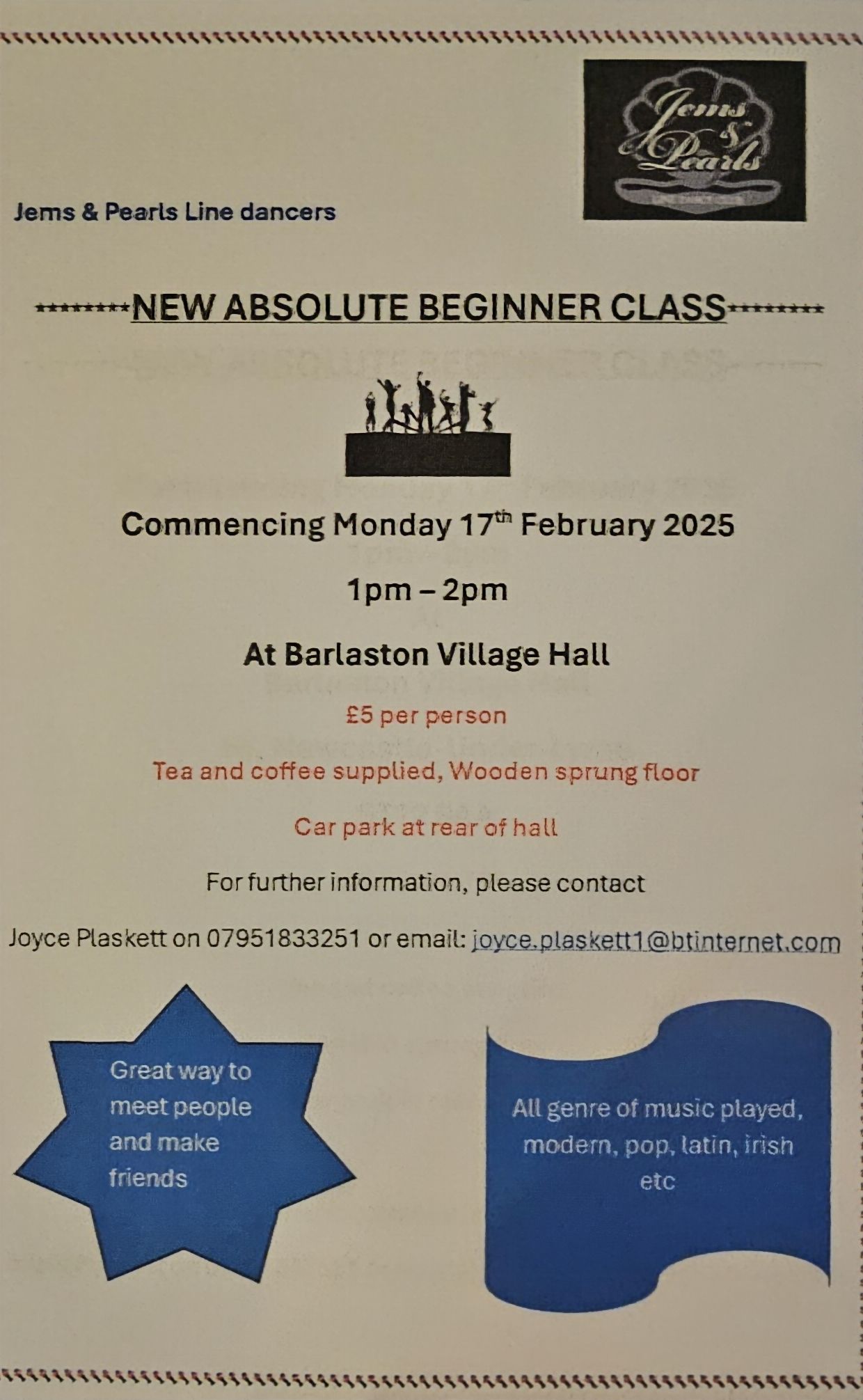 Joyce Plaskett (Jems & Pearls Linedancers) - 07951 833251 or email: joyce.plaskett1@btinternet.com |