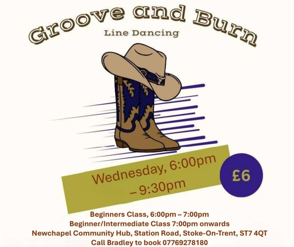 | Wednesday (eve) | Stoke-on-Trent - Newchapel Community Hub, Station Road, Stoke-on-Trent ST7 4QT. Starts at 6:00 PM - 7:00 PM (beginner), 7:00 PM onwards (beginner/intermediate) to 9:30 PM. Admission £6. Please click here to download a flyer for details of this class.. | Groove and Burn (Brad): 07769 278108 |