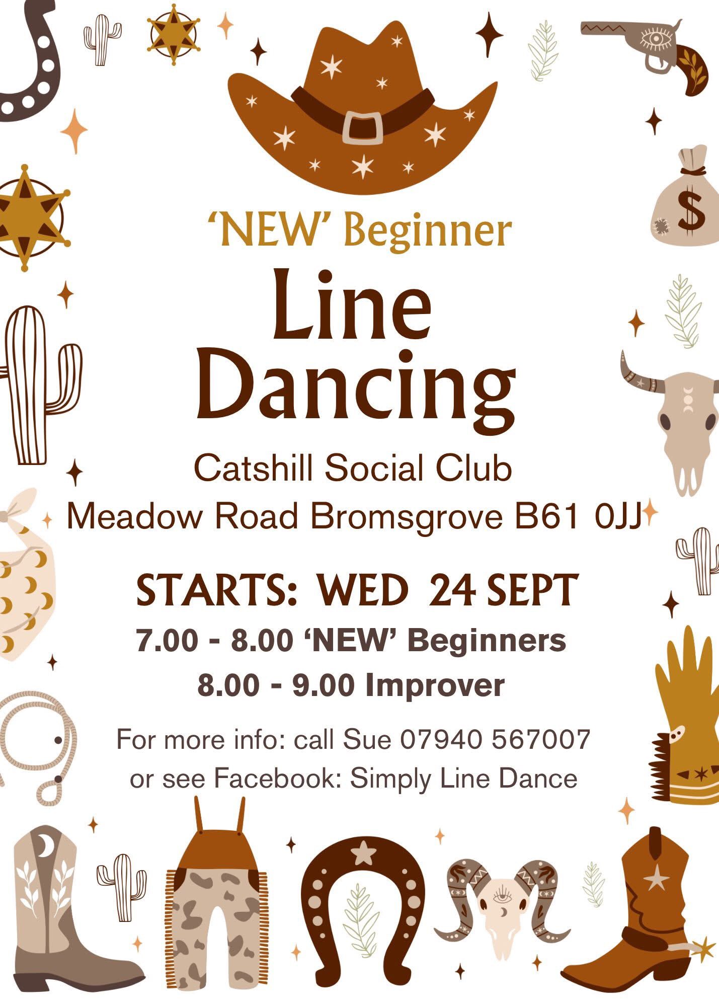 | Wednesday (eve) | Bromsgrove - Catshill Social Club, Meadow Road, Bromsgrove B61 0JJ. Starts at 7:00 PM - 8:00 PM ("NEW" beginner), 8:00 PM - 9:00 PM (improver). Please click here to download a flyer for details of this class.. | Simply Line Dance (Sue): 07940 567007 |