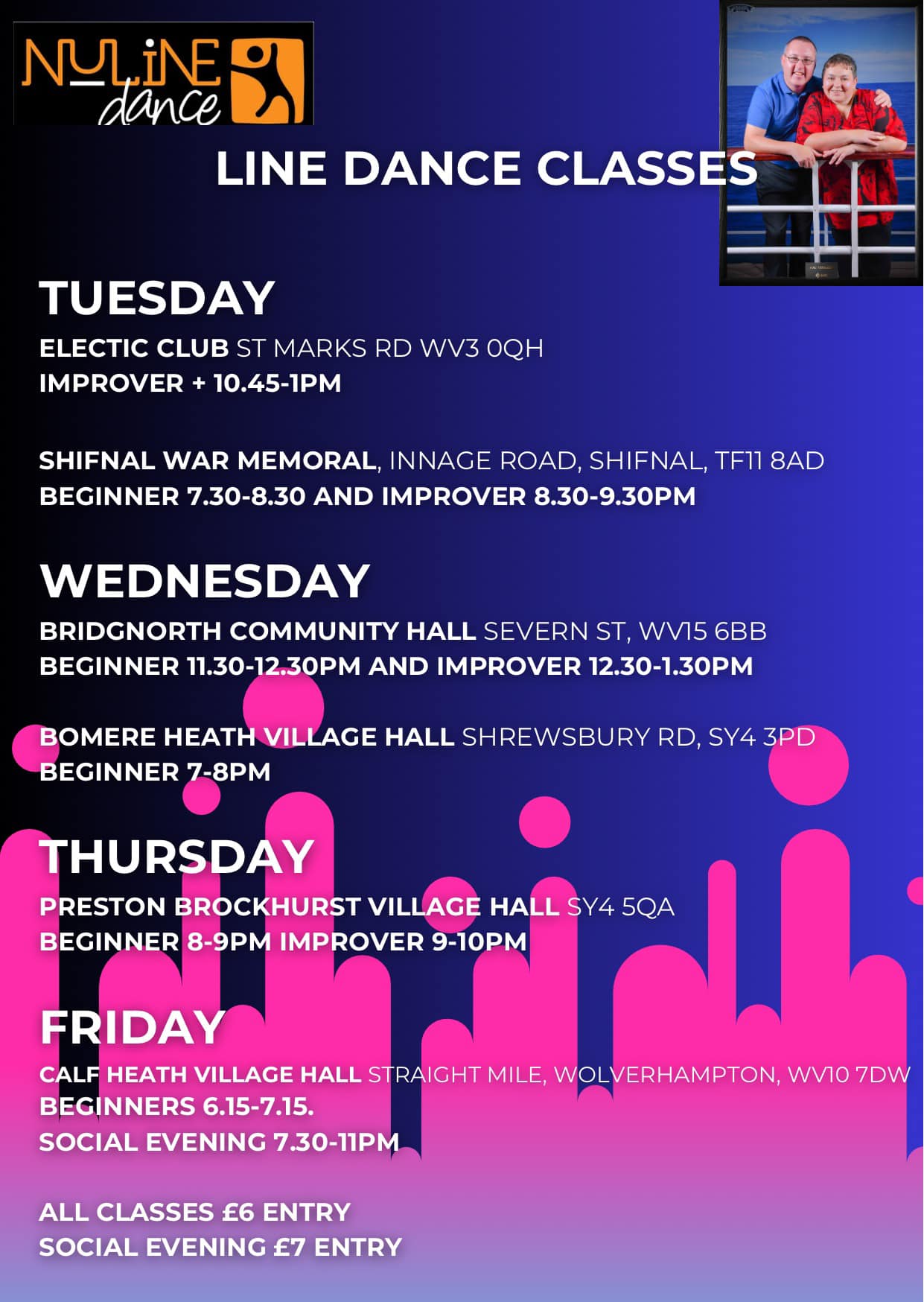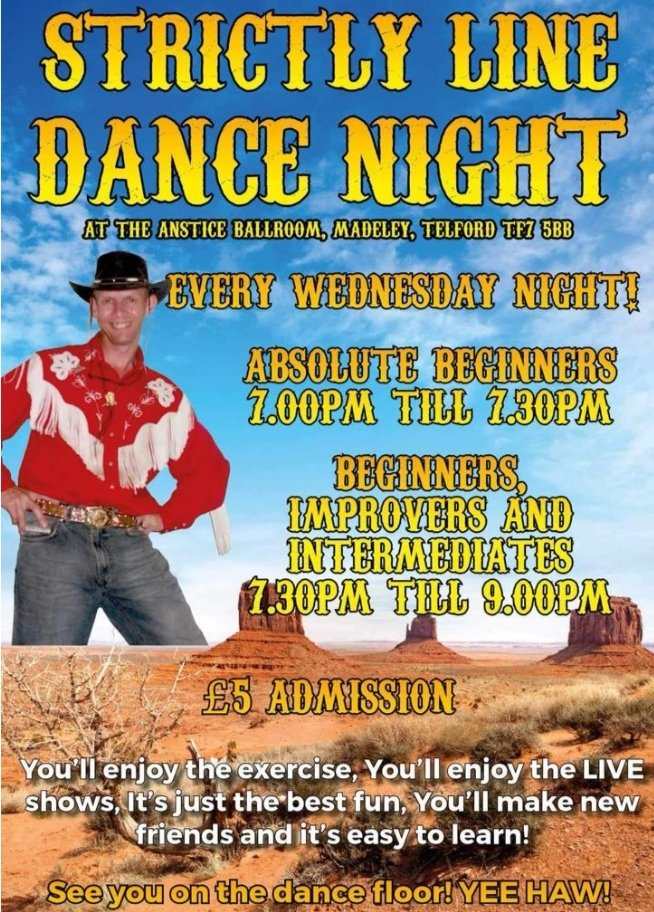 | Tuesday (eve) | Shifnal - War Memorial Club, Innage Road, Shifnal TF11 8AD. Starts at 7:30 PM - 8:30 PM (absolute beginners), 8:30 PM - 9:30 PM (improvers). Admission £6 (adults) or £3 (children). Please click here to download a flyer for details of this class. | NuLine Dance with Steve & Claire 07709 098631 or 07361 907168 |