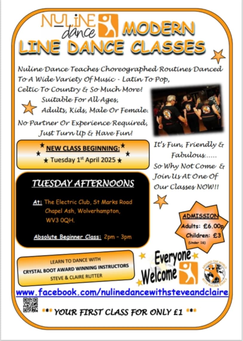 | Tuesday (pm) | Wolverhampton - The Electric Club, St Mark's Road, Chapel Ash WV3 0QH. Starts at 2:00 PM - 3:00 PM, bar facilities available. Admission £6 (adults) or £3 (children). Please click here to download a flyer for details of this class.. | NuLine Dance with Steve & Claire 07709 098631 or 07361 907168 |