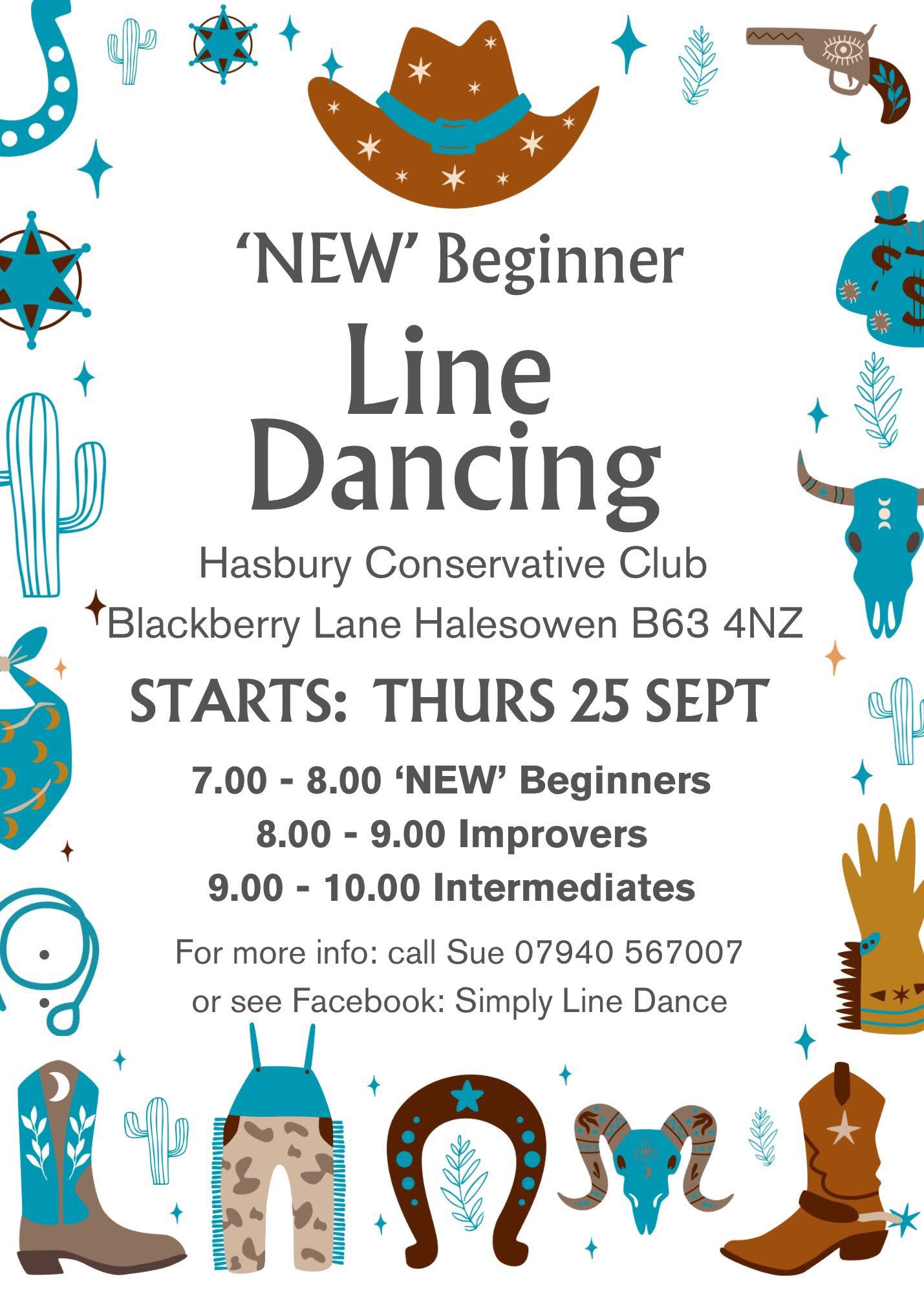 | Thursday (eve) | Halesowen - Hasbury Conservative Club, Blackberry Lane, Halesowen B63 4NZ. Starts at 7:00 PM - 8:00 PM ("NEW" beginner), 8:00 PM - 9:00 PM (improver), 9:00 PM - 10:00 PM (intermediate). Please click here to download a flyer for details of this class.. | Simply Line Dance (Sue): 07940 567007 |
