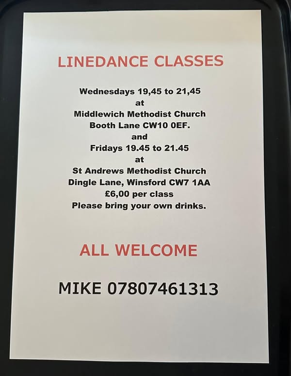 | Wednesday (eve) | Middlewich - Middlewich Methodist Church, Booth Lane, Middlewich, Cheshire CW10 0EF. Starts at 7:45 PM - 9:45 PM. Admission £6. Please bring your own drinks. Please click here to download a flyer for details of this class. | Mike Hitchen: 07807 461313 |