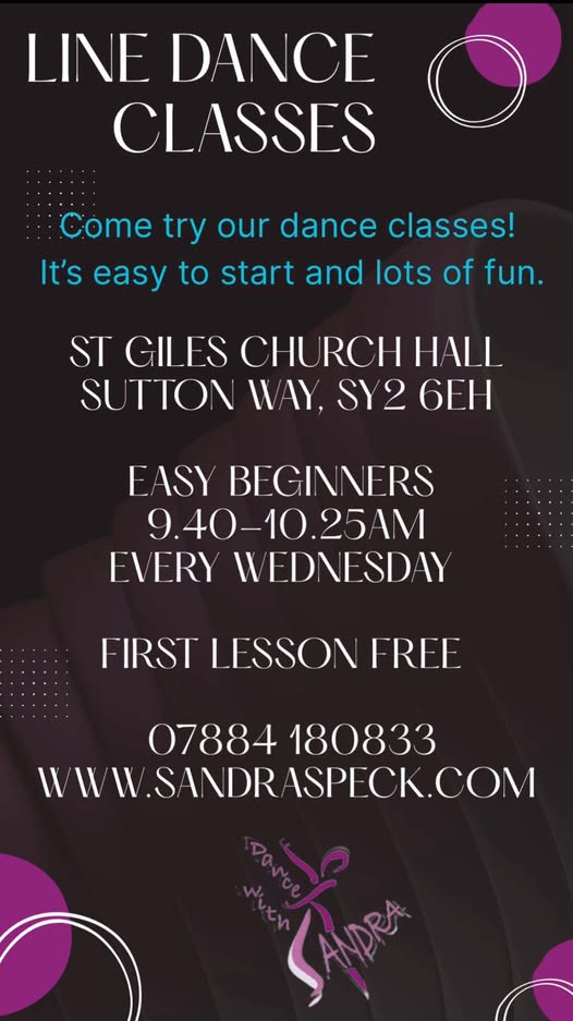 Hall, Sutton Way, Shrewsbury SY2 6EH. **NEW BEGINNER CLASS STARTING 7TH JANUARY 2026** Starts at 9:40 AM - 10:25 AM (easy beginner). Please click here to download the flyer for the new beginner class, then 10:30 AM - 11:30 AM (harder beginner), 11:30 AM - 12:30 PM (improver), 12:30 PM - 1:30 PM (intermediate). Have a look at Sandra's website at the following link: Dance With Sandra |