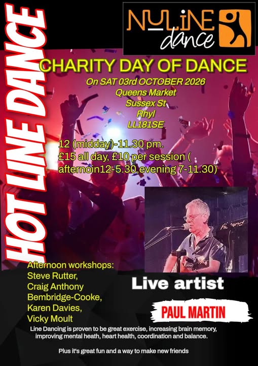 | Starts at 12:00 noon until 5:30 PM, then 7:00 PM until 11:30 PM | MIKE'S NULINERS present a Charity Day of Dance at Queen's Market, Sussex St., Rhyl LL18 1SE (on the promenade